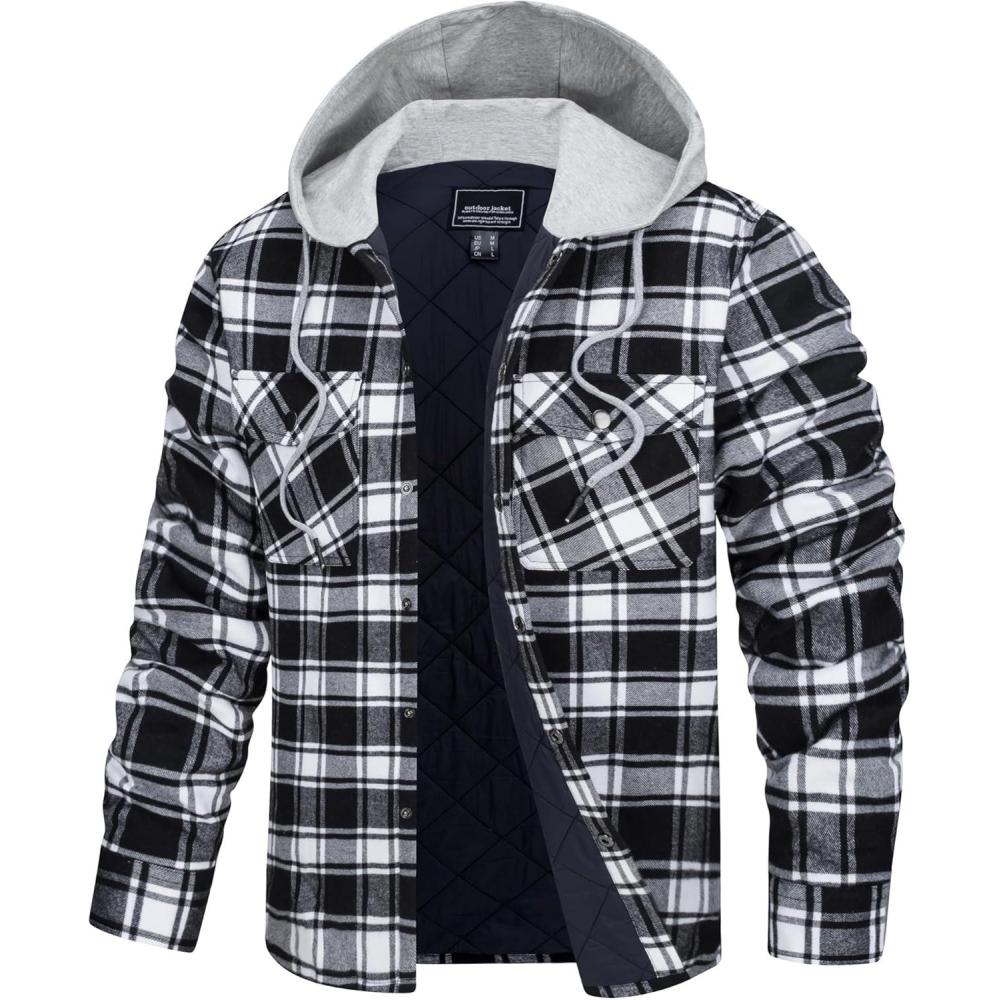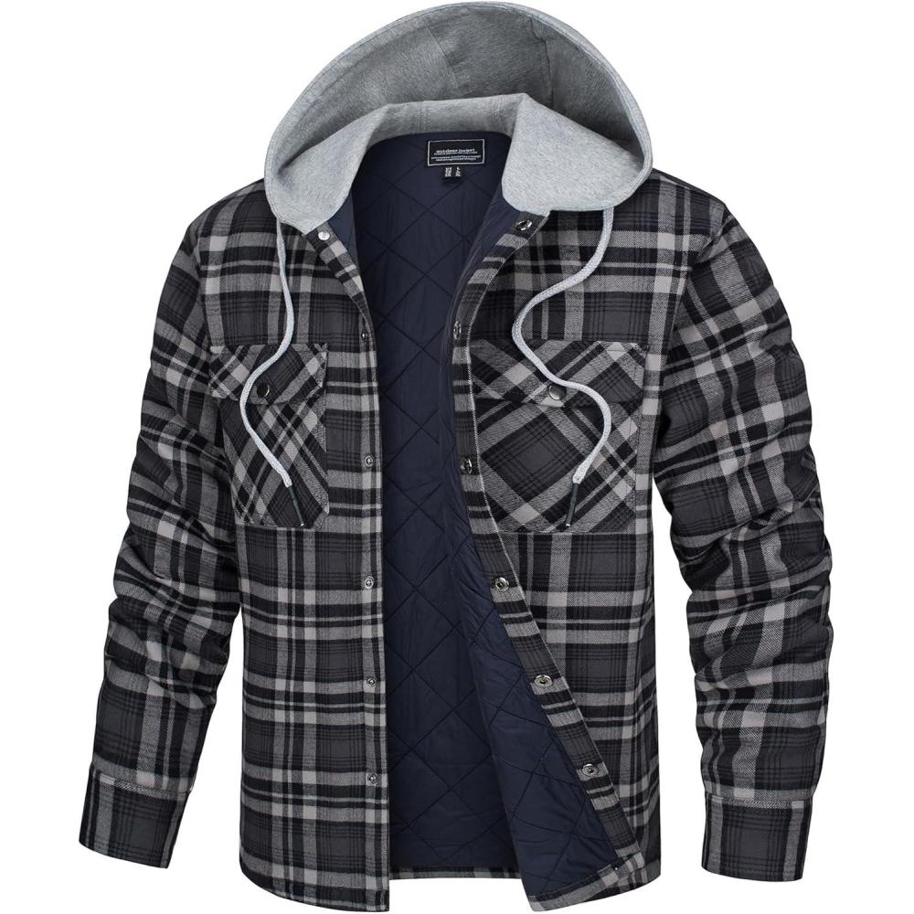 TACVASEN Men’s Flannel Jacket with Hood Quilted Lined Plaid Shirts Jacket Cotton Long Sleeve Button Down Shirt Shacket(Black Grey)