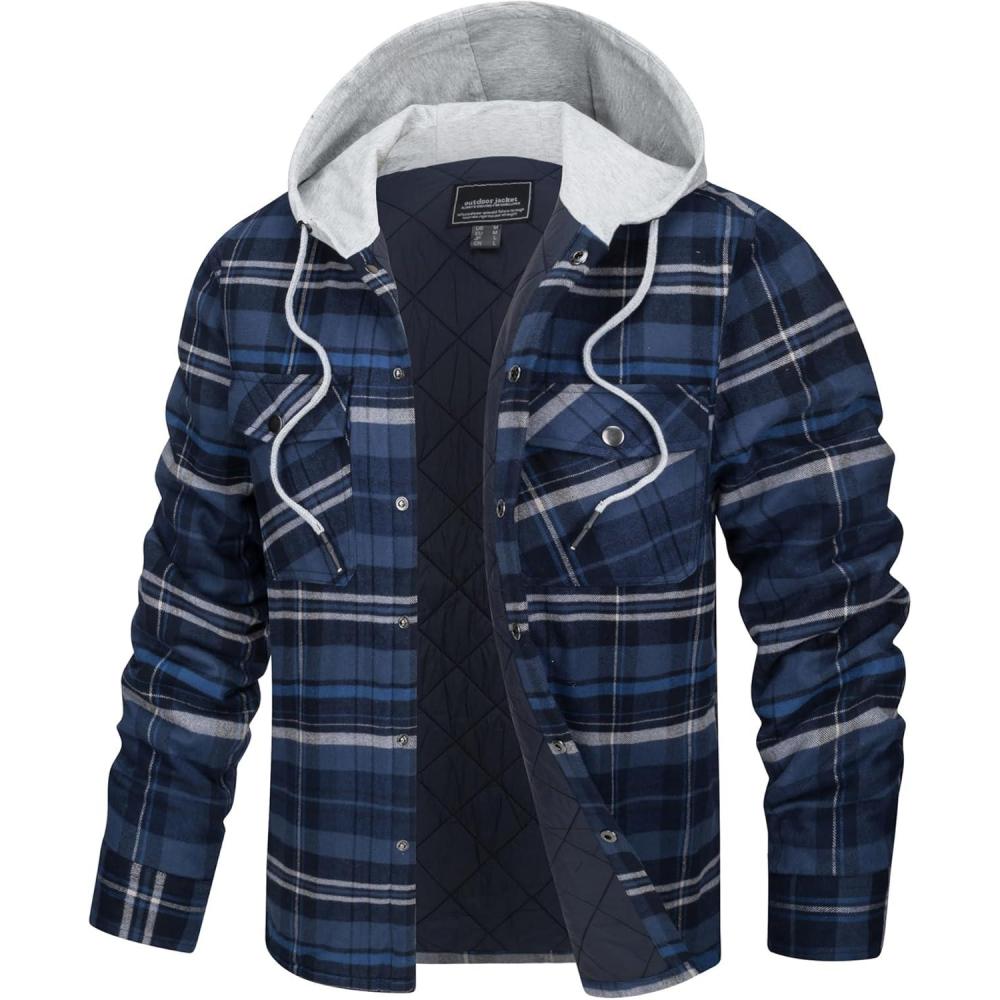 TACVASEN Men’s Flannel Jacket with Hood Quilted Lined Plaid Shirts Jacket Cotton Long Sleeve Button Down Shirt Shacket(Blue Grey)