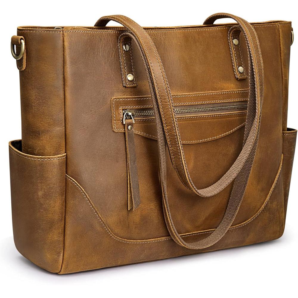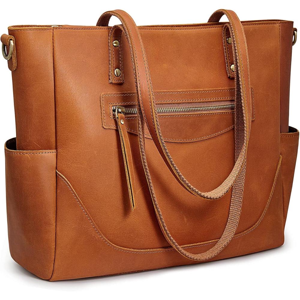 S-ZONE Genuine Leather Tote Bag for Women Large Shoulder Purses Work Handbags with Crossbody Strap Vintage(Cognac)