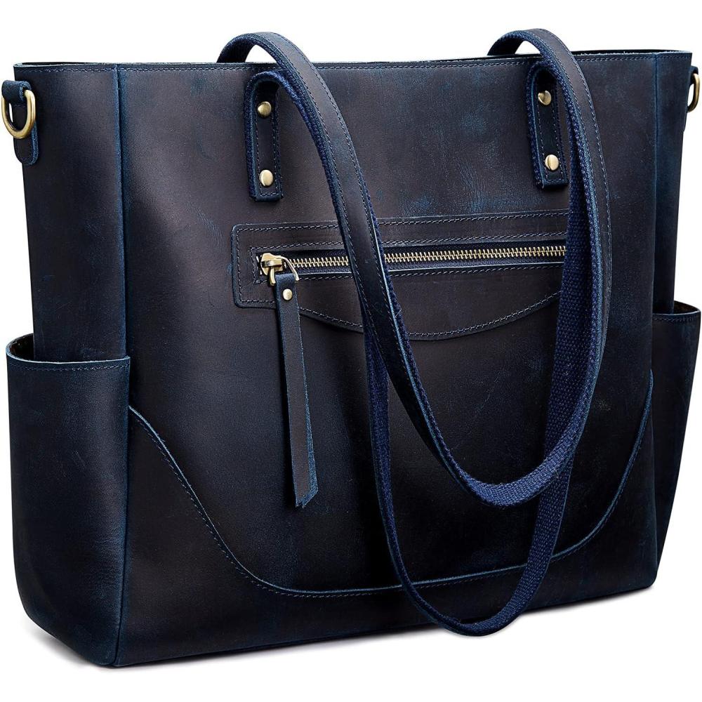 S-ZONE Genuine Leather Tote Bag for Women Large Shoulder Purses Work Handbags with Crossbody Strap Vintage(Dark Blue)