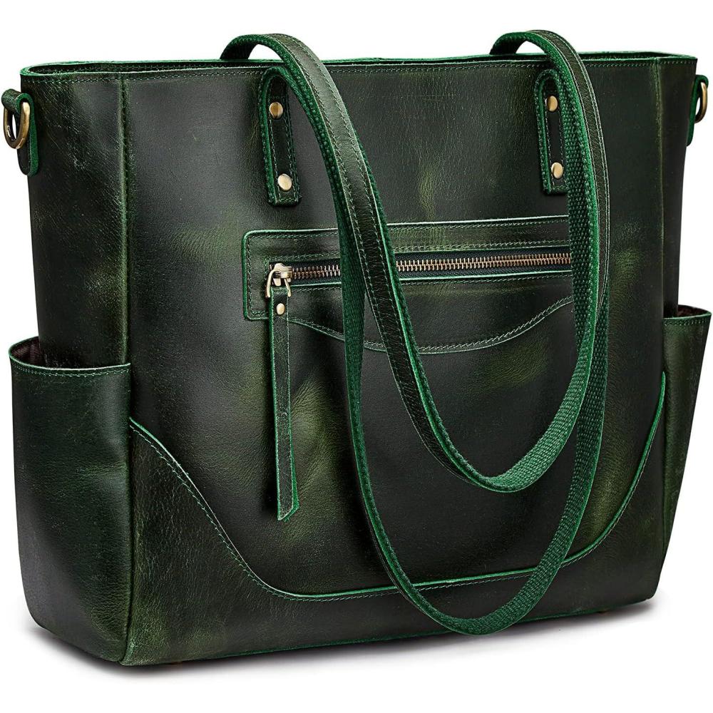 S-ZONE Genuine Leather Tote Bag for Women Large Shoulder Purses Work Handbags with Crossbody Strap Vintage(Dark Green)